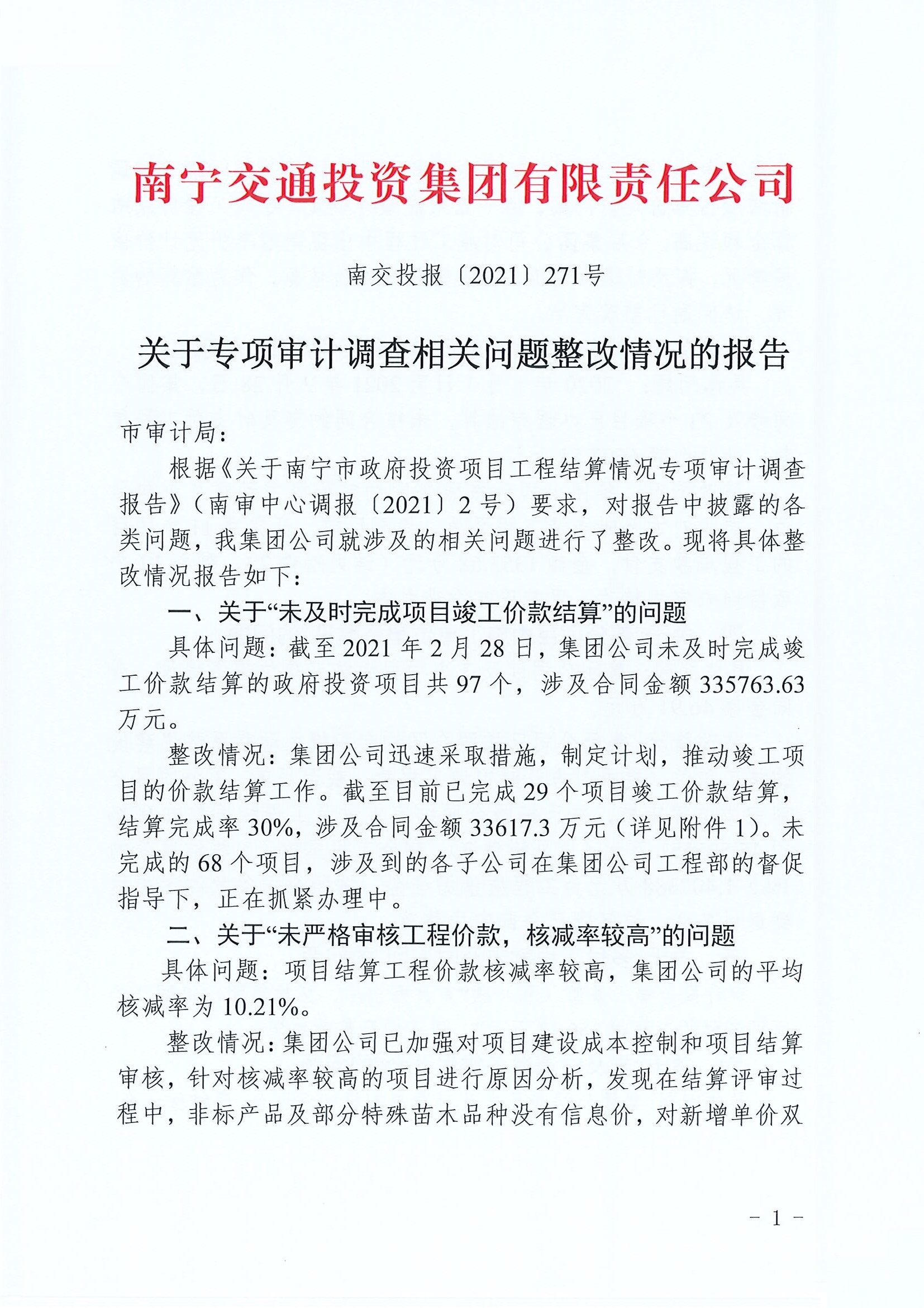 2020年度審計項目發(fā)現(xiàn)問題整改公開-南寧市政府投資項目工程結(jié)算情況專項審計調(diào)查