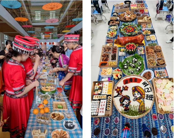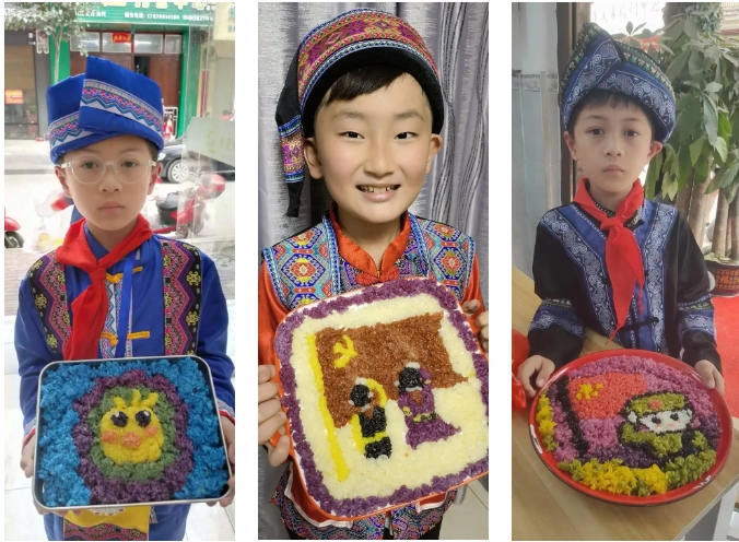 “長桌宴”又稱合攏宴,是侗族、苗族、瑤族等多個民族的風俗習慣,常用于接親嫁女、滿月酒、村寨聯(lián)誼等宴飲活動,代表最為隆重的待客禮俗,已有幾千年歷史。“長桌宴”上有壯族特色的五色糯米飯、艾葉糍粑、壯粽,苗族的傳統(tǒng)佳肴,還有黎族的三色飯……一份份美食造型美觀、色彩鮮艷、香味撲鼻。圖為集團職工拍攝的孩子參加學(xué)?!叭氯被顒?。
